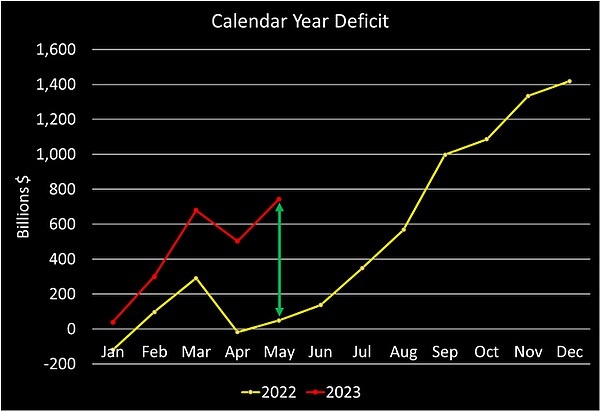 (美国 2023 年与 2022 年的财政赤字走势对比图)