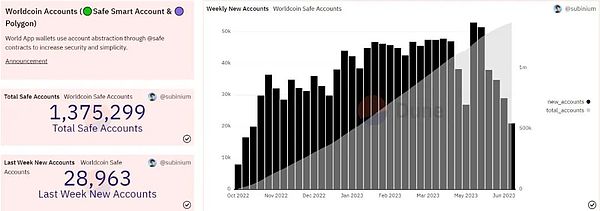 目前Worldcoin在Polygon上共注册了1,375,299个账户,上周新增28,963个账户。从堆积图来看,目前的新增速度与过去比较有所放缓。