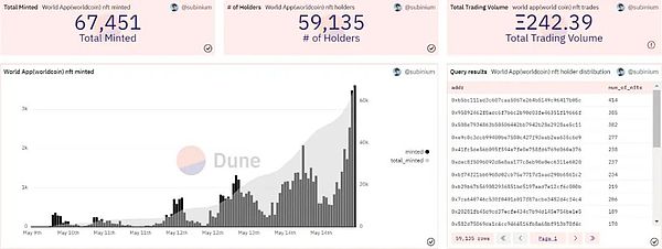 World App NFT总共mint了67,451个,持有人数59,135个,持有个数最多的地址总共持有了414个NFT,排名前十的地址最少持有量为189个。NFT的总交易量为242.39eth(Opensea显示为246eth)。