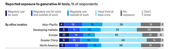既然公司和个人正在尝试使用新一代人工智能,那么,谁使用的最多,用途是什么?麦肯锡的新报告也提供了一些值得关注的见解。