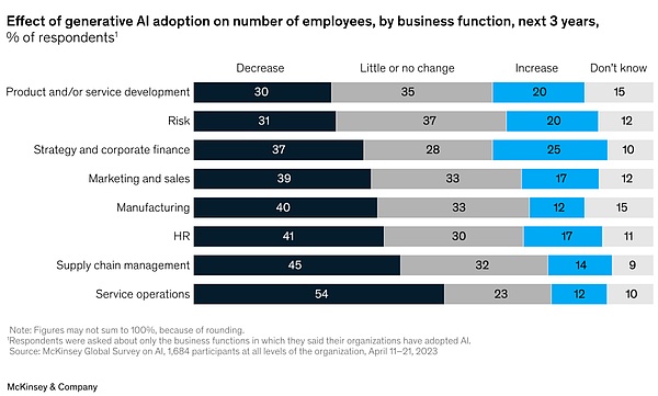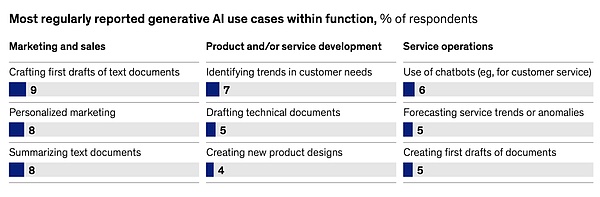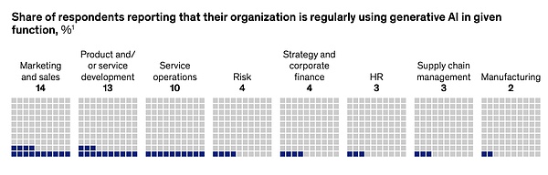 事实上,截至 2023 年 4 月,使用生成式人工智能最多的是营销和销售,占 14%,其次是产品/服务开发,占 13%。