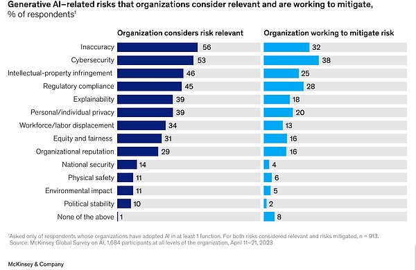 特别是当询问采用人工智能的风险时,很少有受访者表示他们的公司正在减轻人工智能最常提到的风险:不准确。只有 32% 的人表示他们正在减少不准确性,这一比例低于 38% 的人表示他们减轻了网络安全风险。