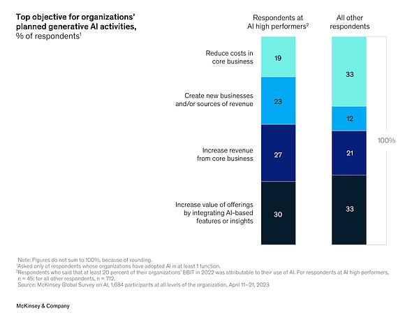 将首要目标锁定在创造全新业务或收入来源的人工智能高绩效企业,是其他企业的两倍。不过,大多数人工智能高绩效企业采用生成式人工智能的首要目标在于增加现有产品的价值。