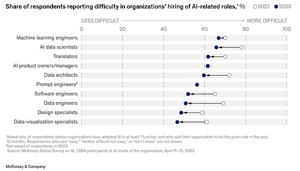 总体而言,虽然招聘与人工智能相关的职位仍然是一个挑战,但在过去一年里变得有些容易了,反映招聘人工智能数据科学家、数据工程师和数据可视化专家等职位存在困难的受访企业变少了。这或许与 2022 年底到 2023 年上半年科技公司的大量裁员有关。