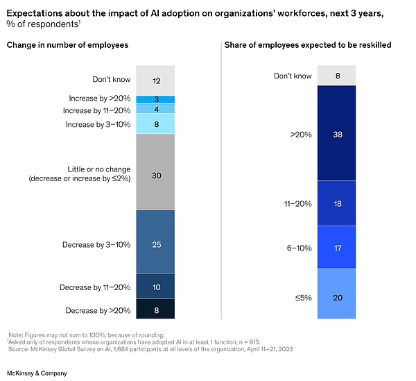 近十分之四的受访者预计,超过 20% 的公司员工将通过再培训获得新技能,而8%的受访者表示,他们的员工规模将减少 20% 以上。