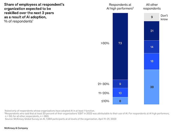 在员工再培训方面,人工智能高绩效公司在未来三年内对超过 30% 的员工进行再培训的可能性,是其他公司的三倍以上。