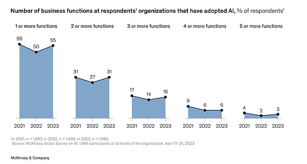 虽然生成式人工智能正在迅速普及,但调查数据并未显示这些新工具正在推动公司整体上的人工智能采用。
