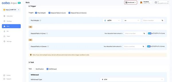 DeFi 机器人:Cobo Argus 在 DeFi 授权功能的基础上,推出了机器人功能,支持用户把特定的 DeFi 协议权限授权给机器人,再由机器人进行自动化操作。例如自动 Claim 奖励、自动卖出与复投、自动撤回等。