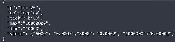 详情:“在“brc-20s”上引入收益/质押的尝试。“收益”表示每个块代币的升值。一个嵌套的 JSON 对象,其中 key “6000” 代表前 6000 个块及其收益,接下来的 8000 个块及其收益。