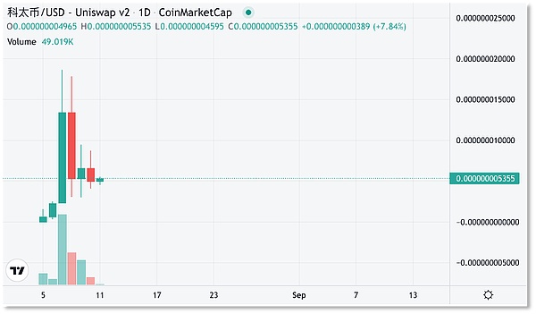 在《孤注一掷》上映首日,科太币已经开始了一波猛跌。Coinmarketcap数据显示,24小时内,科太币在链上交易平台Uniswap中暴跌60%。截至8月11日,科太币持有者仅两千多人。有投资者提示风险,“科太币没有实际价值,流通量很低。如果持币大户抛售离场,崩盘只是一瞬间的事情。”