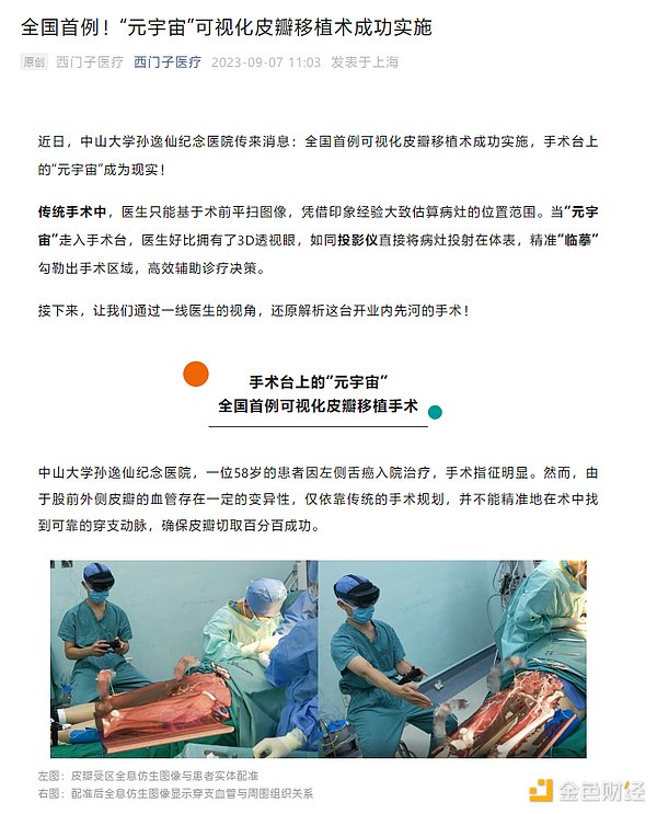 该院口腔颌面外科主任范松团队运用了“元宇宙”医教研解决方案,来完成此次手术。据介绍,此次手术通过将全息仿生实景渲染图实时配准患者实体,在人体表面精准勾画相关区域的血管走行,由此可以实现“可视化、自由式的”皮瓣切取,便能大大缩短手术时间,同时增加手术准确性。