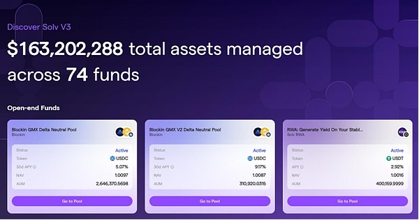 例如我们看到 Blockin GMX Delta Neutral Pool 是一只开放型基金,管理大约 260 万美元资产,根据基金管理人 Blockin 的投资策略进行布局;此外,另外一只开放型基金 RWA: Generate Yield On Your Stable Coins,由基金管理人 Solv RWA 发起,募集 USDT 稳定币,投资于美债 RWA 资产,为稳定币持有者提供美债的生息收益。