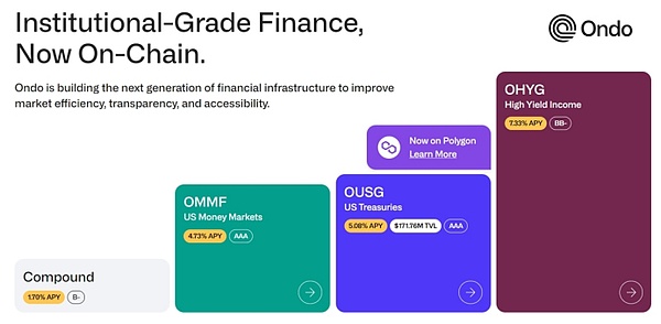 Ondo Finance 于 2023 年 1 月推出代币化基金,致力于为链上专业投资者提供机构级的投资机会与服务,其将无风险/低风险利率的基金产品带到链上,让稳定币的持有者能够在链上投资政府债券和美国国债。Ondo Finance 的两只代币化基金 OUSG 和 OMMF 的底层资产分别是 BlackRock 的短期美债 ETF 和货币市场基金。