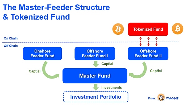 私募基金通过主联架构(Master-Feeder Structure),直接将上一层联接基金(Feeder Fund)代币化来实现整个私募基金部分基金份额的代币化。在主联架构中,基金管理人可从不同类型的投资人手中募集资金创立 Feeder Fund,而 Feeder Fund 把该等资金投资于一个主基金(Master Fund)。投资人在 Feeder Fund 层面进行投资并支付管理费,而交易和投资则在 Master Fund 层面进行。