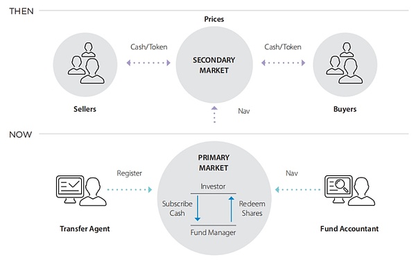 传统基金的运行流程本质上是低效的:(1)基金份额为满足认购而设立,为满足赎回而注销;(2)基金定价不是根据买入和卖出,而是根据基金会计师设定的资产净值;(3)过户代理在资产净值的基础上通过接收、整合订单进行定价,并在集中登记册中通过入账方式结算订单,然后将订单与投资者和基金的现金头寸进行核对;(4)在基金份额和现金结算释放前的三天,基金和投资者将面临市场波动和交易对手风险;(5)基金的流动也迫使基金管理人保留资金头寸,以承担重新平衡基金净值的成本。