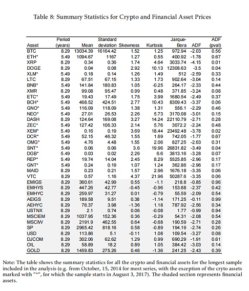 文章选取的加密资产具有很强的异质性,每种钱币都具有独特的特征和功能。纳入这些资产的主要原因与它们在加密世界中的重要性密切相关。这些币根据其主要功能可大致分为五类:a)交换和支付手段(比特币、比特币现金、Dogecoin、莱特币、Dash、瑞波币、恒星币、Zcash),b)智能合约(以太坊、以太坊经典、Gnosis、Golem、Neo、OMG Network),c)隐私(Monero),d)实用性(Binance Coin、MaidSafeCoin、Status、Vertcoin),e)其他(Decred、DigiByte、Augur)。