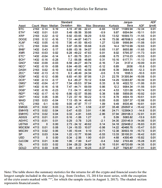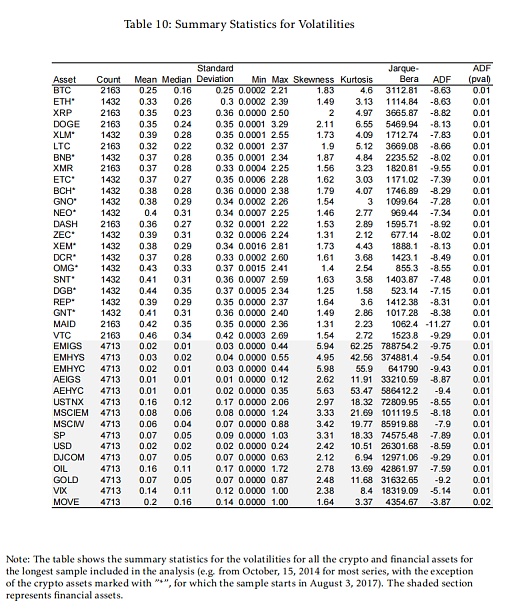 在整个样本期间,比特币的价格变化很大。所有分析过的加密货币都显示出正偏度,这意味着极端的正收益多于负收益,这可能是由于加密货币历来倾向于在价格快速上涨后出现(较少出现)暴跌。相比之下,大多数金融资产也表现出正偏度,但程度低于加密货币,一些金融资产表现出负偏度(如某些债券指数和贸易加权美元)。此外,大量加密资产显示出异常高的峰度,表明尾部较厚,因此相对于正态分布风险更高。相比之下,金融资产的峰度往往要低得多,这些结果突出表明,与其他金融资产相比,加密资产经历极端波动的可能性更大。
