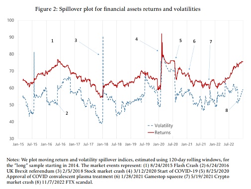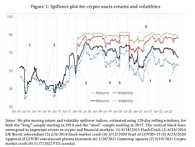 分析表明随着时间的推移,特别是在COVID-19大流行期间,溢出效应的幅度明显增大,这表明相互依存性可能上升(鉴于历史相对较短,这一结论需要谨慎对待)。最后,文章将动荡加剧期间溢出效应的增加与经济金融事件、加密货币市场事件或其他完全外生的事件联系起来。风险厌恶期的高度相关性表明,加密资产可能无法发挥有效的分散功能,而有可能成为在整个金融市场传播冲击的重要渠道。