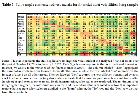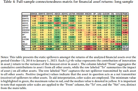 随后文章分析了金融市场收益率和波动率的静态溢出表,与其他金融资产相比股票市场指数表现出较高的关联性。具体来说,MSCI世界股票指数和标准普尔500指数是整个系统收益和波动溢出效应的最大传递者。MSCIW指数是最重要的冲击净释放者(收益率为2.9%,波动率为1.57%)。其他风险资产,如MSCI新兴市场(EM)股票指数和新兴市场高收益主权债券市场指数(EMHYS),也对系统的回报率和波动率冲击有相对较大的净贡献。另一方面,AE投资级债券和新兴市场投资级债券的传导和接收贡献较低,总体上看是净接收者。商品价格和美元指数对冲击的贡献度中等偏高,商品指数是净传递者,美元指数是净接收者。值得注意的是,黄金的方向关联性最小,是冲击的净接收者。鉴于黄金作为避险资产的地位,这并不奇怪。