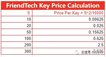 在用户入驻Friend.tech并转入至少0.001E激活账户后,可以以0价格购买自己的第一个key,后续购买者的key价格公式为:(S^2) /16000, S为总体key的数量。价格曲线的设计使得每一个进入者都会推高价格,且后加入者推动的幅度会越来越高。而由于购买数量为整数,所以实际的价格曲线是离散的,而非连续曲线,导致实际的购买价格偏高,而卖出价格偏低。而16000是团队考虑市场可能参与人数和流动性之后的选择。95%以上的房间人数小于50人,价格低于0.156ETH,参与门槛较低。