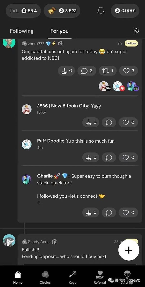 New Bitcoin City定位为Bitcoin上的Friend.tech, 同样采用了PWA开发,支持BTC, ETH和AVAX支付,迁移了Friend.tech和Star Arena上的持仓和社交关系,即在另外两个平台上的持仓在登录New Bitcoin City时仍然有效且会被聚合。相对Friend.Tech,其功能更加丰富,群聊支持语音/红包/Gif/图片上传,也支持在公开广场发布消息和内容打赏,类似于Twitter动态,群聊还内置了五款简单小游戏。为了解决Friend.tech中用户(3,3)玩法带来的信任问题,NBC在合约层面对3,3行为进行了约定,强制30天不能卖出。房主可以定义进入房间的最低门槛,将key碎片化,比如某头部玩家的key价格过高时,房主可以选择将入群门槛价格设置为0.1key;也可自定义key的交易抽成,目前默认8% 给房主,2% 给平台;支持一键批量买 Key 或向多人发送(3/3)请求,类似Blur的扫货功能。在吸引用户流量方面除了传统邀请码外,还增加了交易所常用的返佣设计。但整体设计过于复杂,且NBC作为团队多条产品线中的一部分,运行在后续开发运营持续性有待考证。