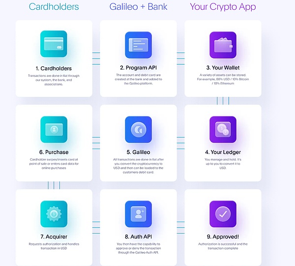 从上图中可以看到,有发卡需求的加密应用可能只是需要提供钱包地址和管理账目(紫色),消费者的开卡、交易、授权、清算等行为全由 Galileo 完成(蓝色)。