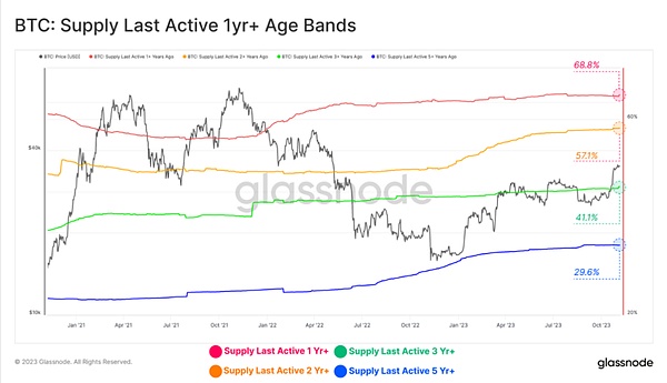 比特币的市场供应历来处于紧缩状态,而近期尤甚——许多描述“比特币不活跃”的指标已经达到了多年甚至历史新高。这些数据都表明了比特币市场供应的紧缩状态非常严重,考虑到比特币价格在年初至今的强劲表现,这一反常的现象令人尤为关注。考虑到比特币预计在明年4月再次减半,再加上当前美国现货ETF的积极势头,预计未来的几个月对比特币投资者而言将是令人兴奋的。