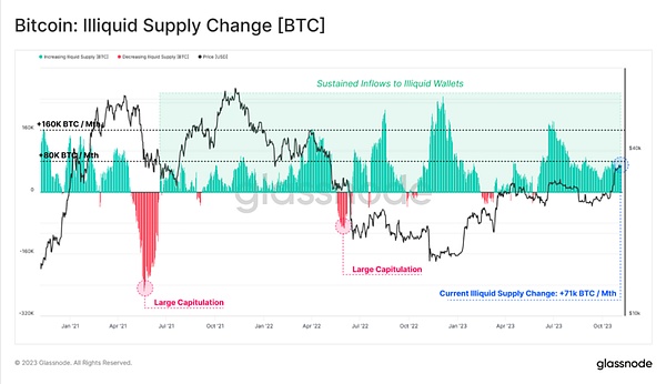 比特币的这种供应紧缩的趋向也体现于非流动性供应的月度变化率上。目前非流动性供应仍旧处于已持续多年的净增长期内,且仍在以每月超过71,000枚比特币的速度继续增长。