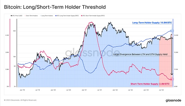 图5:长持/短持投资者的比特币供应量随价格出现明显的分水岭