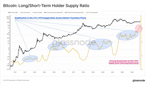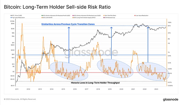 然而,对于长期持有者群体来说,虽然他们的卖方风险比率略有上升,但在历史背景下仍然维持在一个非常低的水平。该指标目前与2016年和2020年末的情况类似,而这两个时期的比特币总体供应也呈现非常类似的紧张情况。