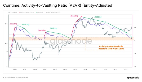 自 2021 年 6 月以来,A2VR 指标一直处于下降趋势,2022 年 6 月后梯度明显变陡。该指标现已达到与2019年年初和2020年年底类似的低点,这两个指标都发生在市场出现显著上升趋势之前。这也表明2021-22周期的 “繁荣” 已经完全被市场冲走。