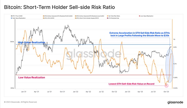 在这种情况下,我们仅考虑短持投资者群体,因为他们是日常价格走势的主要驱动力之一。在最近价格上涨至 35,000 美元之后,卖方风险比率从历史低点飙升,表明许多“新比特币”(指持有时间不长的比特币)的“重新觉醒”。这说明该群体近期出现了较大的盈利。