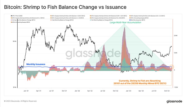 如果我们单独关注那些持有规模较小的持有者,比如“虾”(<1BTC)、“蟹”(1-10BTC)和“鱼”(10-100BTC),则会发现这些持有者在我们的观察研究中的重要性愈发凸显。该子组的余额增长率目前相当于新开采供应量的92%,并且自 2022 年5月以来一直保持在较高状态。