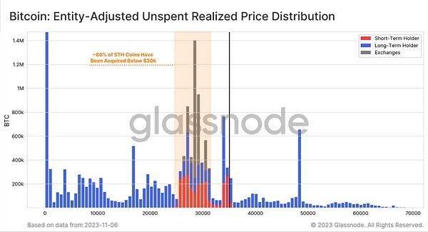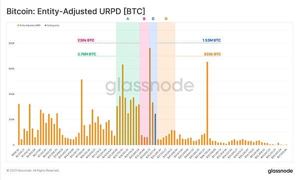 A部分:在2023年的第二季度和第三季度,市场上有大量的比特币堆积在26,000到31,000美元的价格区间中。
