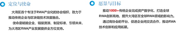 大湾区RWA商协会旨在整合行业资源,规范行业发展,加强企业、机构及专业人士间的交流与合作,推动 RWA 领域技术创新与应用,促进现实世界资产数字化转型。制定行业规范与标准,引导行业健康、有序发展。加强与政府部门、科研机构等的合作,争取政策支持,推动产学研用协同发展。