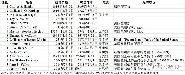 伯南克之后是耶伦,再之后,就是鲍威尔,历任美联储主席的情况见下表。
