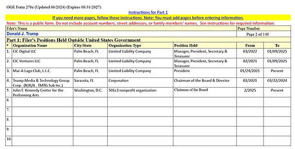 根据文件披露,除去美国总统等政府相关任职以外,特朗普的 Title 还包括: