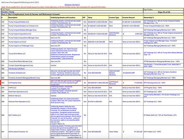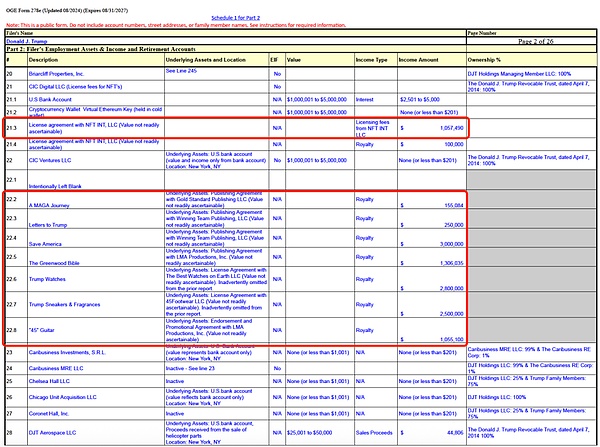 需要重点说明,这份财务状况披露文件的截止日期为 2025 年 1 月。因此,发行于今年 1 月 18 日的“特朗普 Meme 币” TRUMP 的相关收入以及随后包括 MELANIA 代币、WLFI 发行的 USD 1 等相关收入均未收录在内。饶是如此,特朗普的个人资产也已称得上“家资颇丰”。