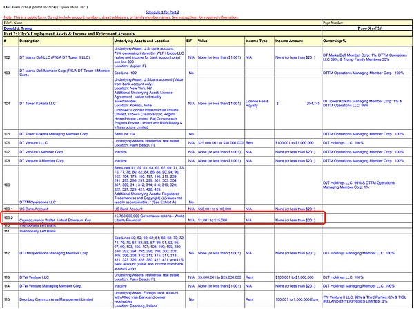 除去 WLFI 代币销售所得的直接收入以外,特朗普还手握通过 ETH 钱包持有的 157.5 亿枚治理代币。财务文件中将其价值计算为 1000-15000 美元左右,收入则记为不足 201 美元。(注:WLFI 第一轮销售单价 0.015 美元,第二轮销售价 0.05 美元,若按照目前场外 0.1 美元价格计算,特朗普持有的代币价值 15.7 亿美元。)