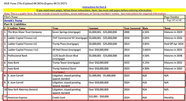 此外,特朗普的财务文件中还提及了自己的 11 负债,其中包括: