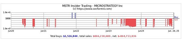 Strategy ,这套“无限增长”理论的提出者,其内部高管一直在减持手中股票$MSTR。据SecForm4.Com 数据显示,自 2023 年 6 月以来,Strategy 内部人士进入集中抛售期。Protos报道指出,仅过去 90 天内,高管累计出售股票总额已达 4000 万美元,卖出次数是买入次数的 10 倍。