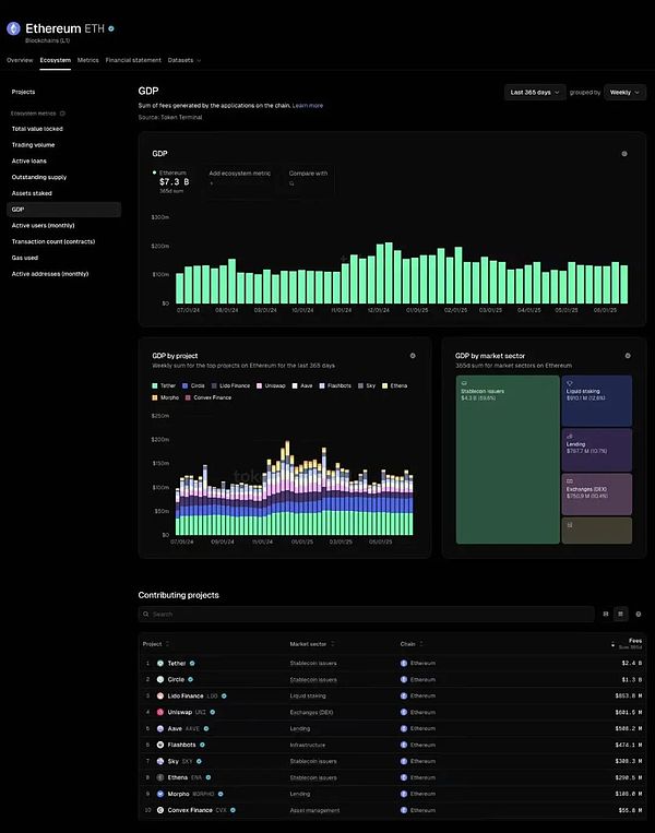 据 Token Terminal 的数据统计,在过去 365 天内,以太坊生态系统总共创造了约73 亿美元的收入。是的,你没看错,不是交易额,不是估值,而是实打实的收入。比很多国家的财政收入都多。