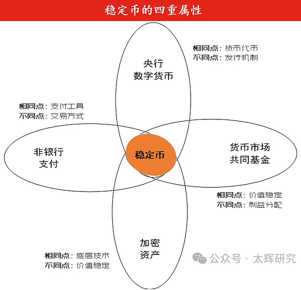 整体而言,稳定币是加密资产、央行数字货币、第三方支付以及货币市场共同基金的综合体: