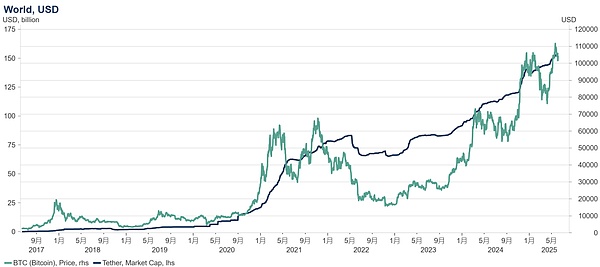 在笔者看来,无论是香港还是美国的稳定币法案,都不足以从根本上改变稳定币市场规模的增长轨迹。事实上,回顾稳定币市场的发展历程,其规模变动的最根本驱动因素是区块链生态是否存在赚钱效应。在2020-2021年期间,以比特币为代表的加密资产因流动性宽松而大幅上涨时,自然有更多的玩家将法币兑换为稳定币并参与交易,这一时期稳定币总规模由60亿飙升25倍至1500亿;而当2022年后加密资产陷入熊市,投资者逐步退出市场,并将稳定币兑换回法币(图2)。从这个角度看,稳定币更像是拉斯维加斯赌场中的筹码,或者投资者在券商软件中的证券账户余额——其需求与风险资产的投资热度正相关。