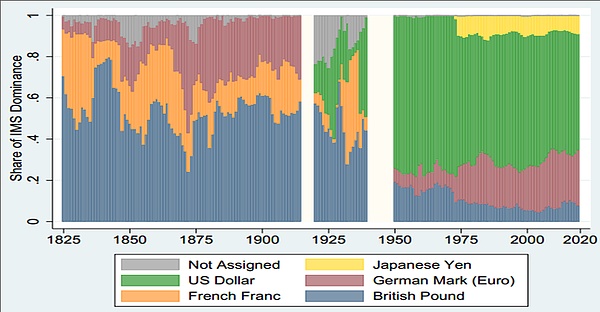 尽管今天美元稳定币的地位看似坚不可破,但法币的历史经验表明,国际货币体系并非一成不变,这为其他稳定币的发展留下了空间。学术界对此存在两种不同观点:"哈佛学派"认为单极货币体系更为稳定(Gopinath, 2015; Farhi and Maggiori, 2018),过去75年的美元体系实践似乎印证了这一论断。但"伯克利派"则持不同观点,认为尽管每个历史时期都存在"主导货币",但多极货币体系才是历史常态(Eichengreen et al., 2017; Gourinchas and Obstfeld, 2012)。从长历史视角来看,20世纪50年代以来的美元独大局面在货币史上并非常态(图5)。在整个19世纪,英镑在国际储备中的占比仅为50%左右,剩余50%的市场份额被法郎、德国马克等货币分割。