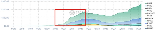 内部流动性不足,只能向外求。在 DAT 的推动下,伴随着 ETH 三倍多的涨幅,许多关于稳定币和 RWA 的故事才有了最现实的基础。