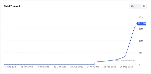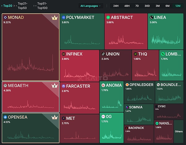 在注意力层面,上图随机截取了 Kaito 上 Pre-TGE 项目的 mindshare。在前 20 的项目中,我们可以划分出不下 10 个细分赛道。如果让我们用几个词概括 2021 年市场上的主要叙事,大多数人可能都会说“DeFi、NFT、GameFi/Metaverse”。而近两年的市场似乎很难让我们立刻反应并且用几个词描述出来。
