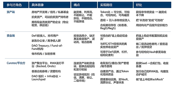 RWA的本质和核心价值创造:RWA本质是现实世界资产的链上再发行,重写“发行—流转—定价—交易—清结算—组合”;其价值来自1)高效可信清结算、2)开放式资金与资产匹配、3)资产可组合性。提升企业资本效率与资产可塑性。
