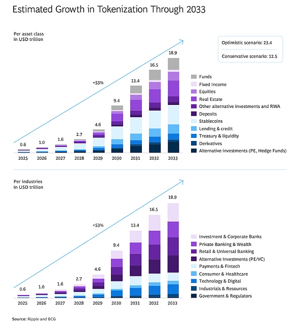 2025年,代币化现实世界资产(RWA)市场规模已接近3000亿美元,部分预测指出到2034年该市场可能达到30万亿美元。