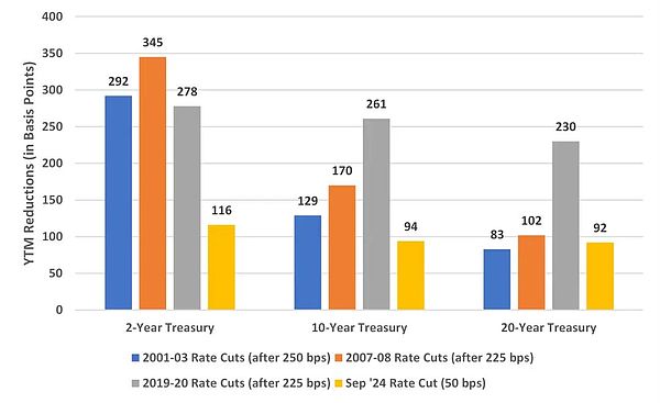 根据 Bondsavvy 的分析 ,不同降息周期中 10 年期美债收益率的降幅相当稳定: